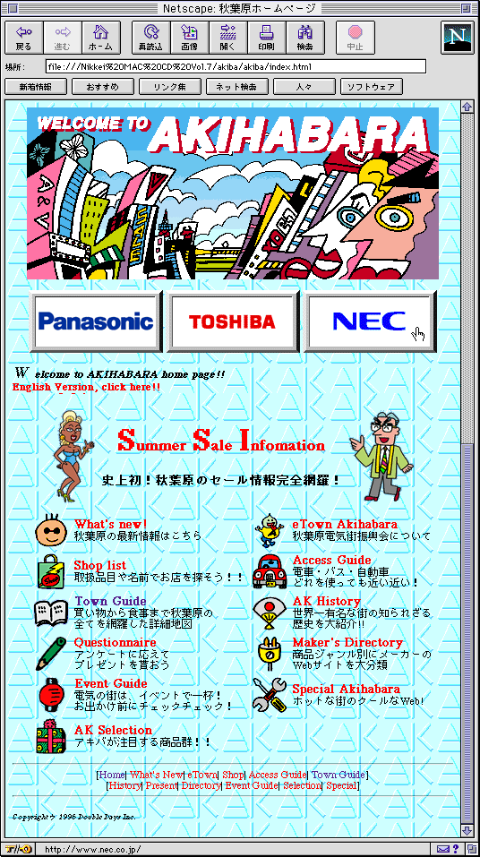 「ボーナスは大切にネ!! 秋葉原を上手に歩こう」 (“Take care of your bonus! Walk well in Akihabara.”) is a copy of the Akiba website dated June 1996, some four months before the earliest version in the Wayback Machine. A lot of the files that comprise the website are dated 1993, which I assume is when the site was first created. This sort of hand-built site really brings back some fond memories of the websites I built in the mid-90s: image maps, optimised GIFs, no content management system. Ah! The good old days.
